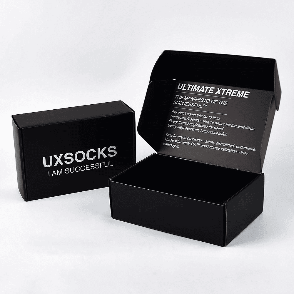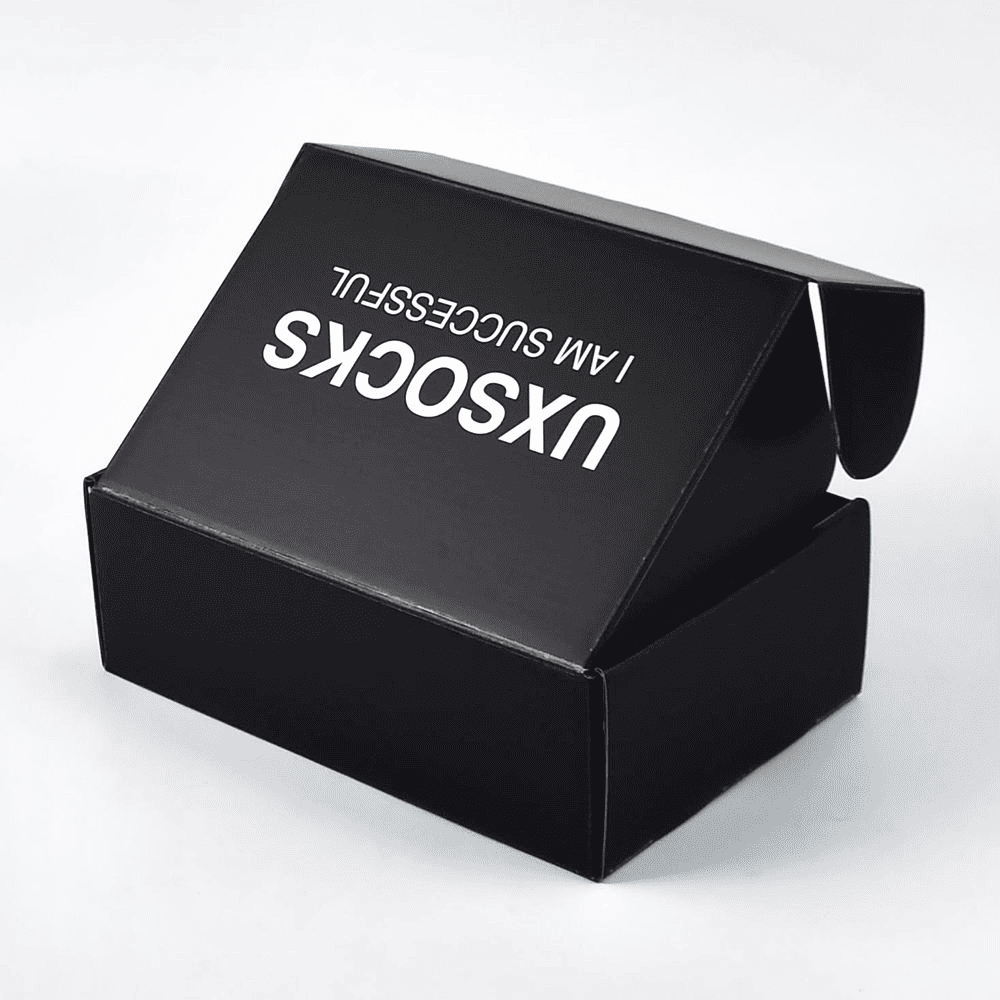 Durable matte black corrugated gift boxes with custom logo printing. Sturdy, crush-resistant structure ideal for premium product packaging, featuring impactful inner print and customizable branding.